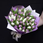 Тюльпан пионовидный дабл прайс – 25 шт.Тюльпан белый – 26 шт.Пленка дизайнерская – 2 шт.Лента атласная – 1 шт.